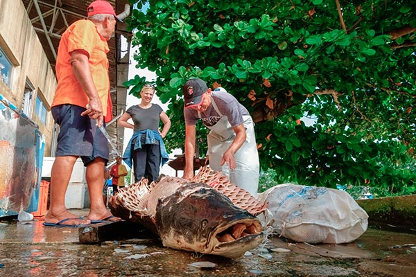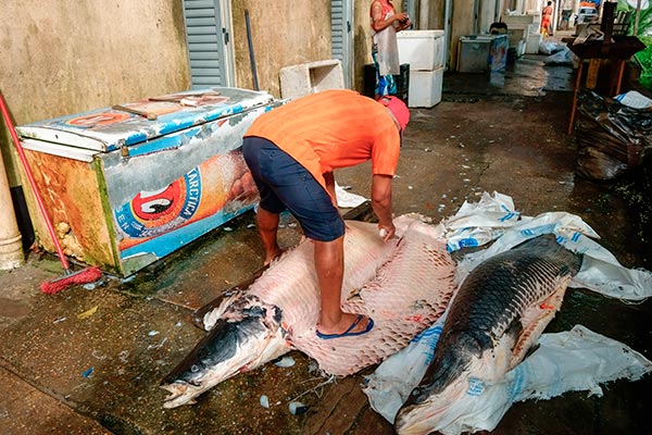 Im Fährhafen haben wir noch ein paar Minuten Zeit bis noch andere Besucher der Lodge eintreffen und schauen uns den Markt an. Vor allem die Fischstände. Unser Guide winkt uns ihm zu folgen. Hinter einem der Stände wird ein Exemplar des größten Süsswasserfisches der Welt, eines Arapaima, filetiert. Der Schuppenpanzer des urzeitlich anmutenden Monsters kann nur mit der Machete entfernt werden. |