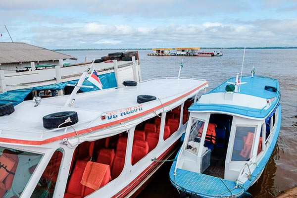 Pünklich kurz nach 7.00 Uhr steht der Kleinbus wieder vor dem Hotel und es geht zum Fährhafen von Manaus. Der Guide, er wird die nächsten Tage für uns da sein, erzählt, dass die Stadt wegen des Hochseefähigen Amazonas Zuganges und der Zollfreiheit in den letzten Jahren enorm viel Industrie angezogen hat und tatsächlich dominieren vor allem japanische Firmenzeichen aber auch deutsche konnten wir sehen. |