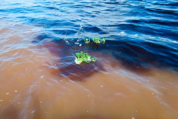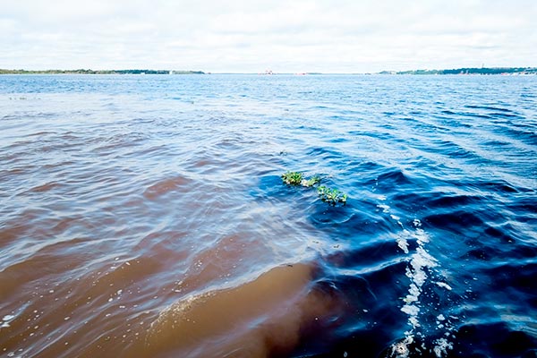 Mit einem schmalen Fährboot mit starken Außenborder düsen wir über den Rio Negro zu der Stelle, wo das Wasser beider Flüsse, des Rio Negro und des Rio Brianco, nebeneinanderfließen ohne sich zu vermischen. Was für ein Naturschauspiel. |
