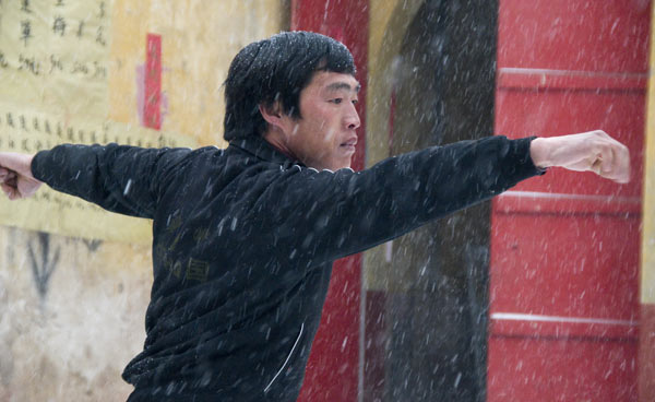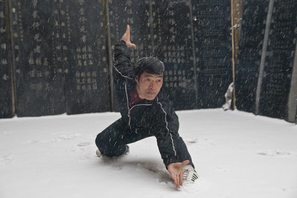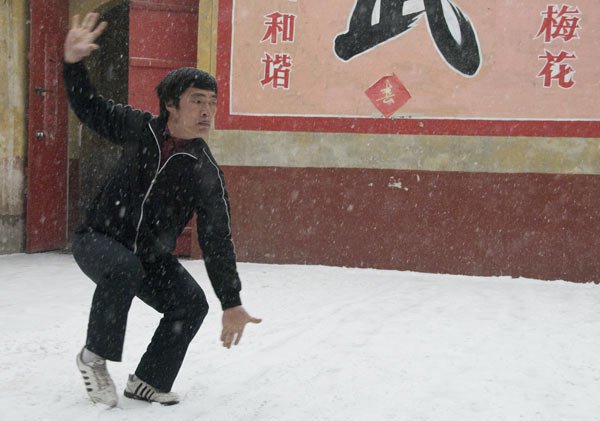 Für jetzt hatten wir uns verabredet das Training der Wushuschule zu beobachten. Als Ersatz für diese nun vom Schnee verhinderte Idee führt uns nur der Wushu Lehrer Fan eine Übung im Innenhof des Tempels vor.