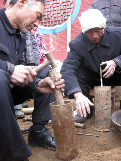 und stampfen die Männer die fertige Masse in die Eisenhülsen ein.