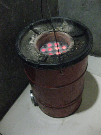 Zylindrische Brikettstücke mit Löchern werden in eine Kartusche aus Ofenziegelmaterial gesteckt und brennen darin vor sich hin.