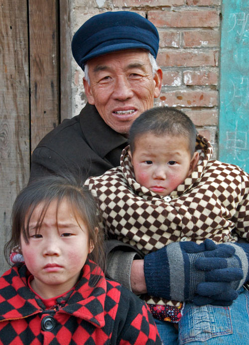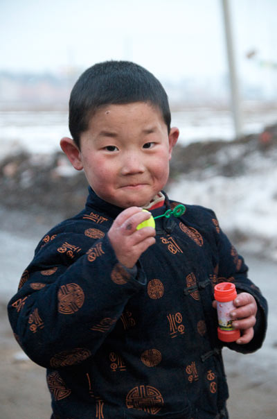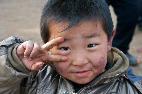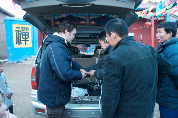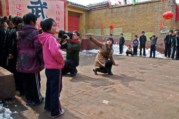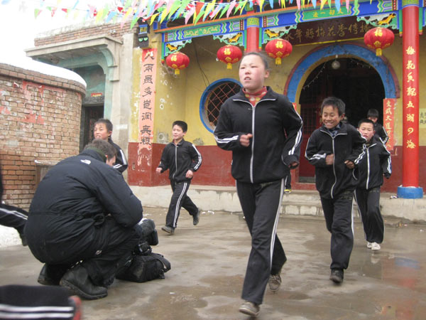 Unse nächste Aufgabe ist die Wushu-Gruppe beim Joggen durchs Dorf zu drehen. Eine Gelegenheit, über den Tagesablauf der jungen Kampfkünstler zu sprechen. 4.00 Uhr aufstehen und Jogging. Danach Training, Schule, Abendbrot und wieder Training von 7 Uhr abends bis 10 Uhr nachts. Schlafen gingen die Kleinen, erklärt Ray, zwischen elf und Mitternacht. Er, Ray, sei auf wenig Verständnis gestoßen, als er durchsetzte bis acht zu schlafen. Da er mit einigen der Schüler gemeinsam in der Hütte schläft, kann er auch schlecht vorher zu Bett gehen. Die Eltern dieser Kinder halten im Interesse der Teilnahmedisziplin an der Wushu-Schule es für besser, dass die Kleinen in der Hütte nah dem Tempel schlafen.