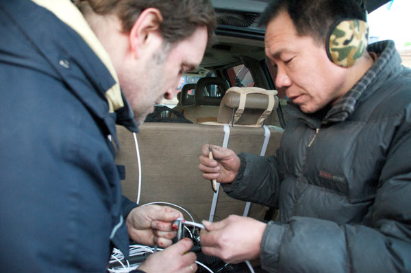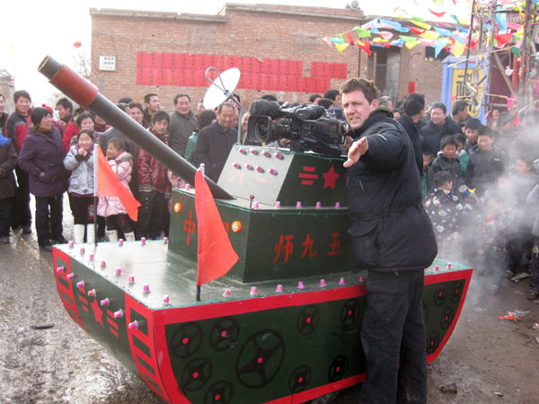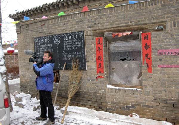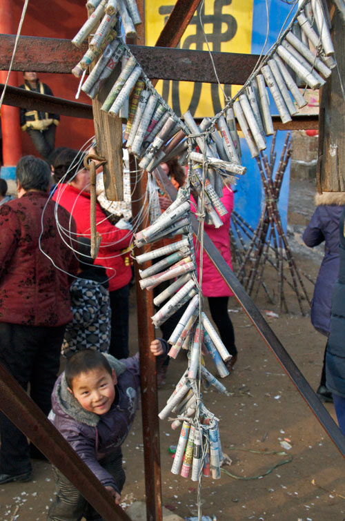 Wir haben uns aufs Feld verkrümelt, es ist uns zu gefährlich auf dem Tempelvorplatz. Unsere Vorsicht ist berechtigt. Der mit Feuerwerk geschmückte Mast der eigentlich von unten nach oben brennen sollte, fängt durch den Funkenregen eines ganz besonders schönen Feuerballs unfreiwillig Feuer, allerdings von oben. Das löst eine heitere Panik unter den Zuschauern aus und gibt uns keine Chance das Zehn-Minuten-Versprechen zu überprüfen. Am Ende sind wir völlig durchgefroren. Dabei sind wir es, die spezial Funktionsklamotten und Daunenjacken tragen. Das Drehmaterial ist, Dank unseres hervorragenden Kameramannes Heiko Käberich, dramatisch schön . Sehr herzlich werden wir verabschiedet, nicht ohne noch mit Spezialitäten der Gegend beschenkt zu werden. Drei anstrengende aber wunderbare Tage gehen zu Ende. Am liebsten würde ich jetzt gleich China für immer verlassen und diesen Eindruck vom unglaublichen Dorf Gucheng durch keine Erfahrung mehr trüben lassen. p.s. Ich wollte ja noch eine Eintragung über die Rückfahrt machen. Wir bekamen keine Rückfahrkarten und mussten die Autobahn nehmen. Da aber der Tenor dieses Berichtes genau der Sorge die ich gerade aufgeschrieben habe Futter gäbe, lasse ich ihn einfach weg und fahre 3 Tage später erst einmal wieder zu meinen Lieben nach Hause. |
