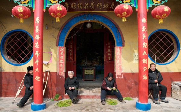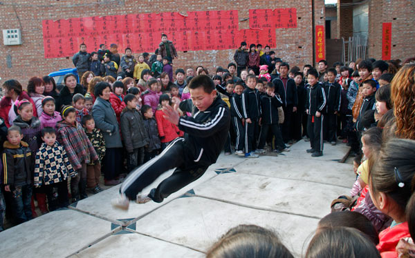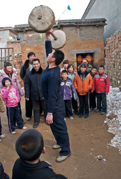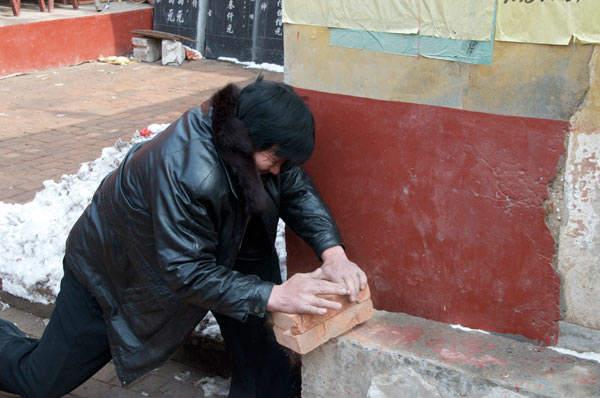 Das Dorf hat einen Meihuaquan Wushumaster eingeladen. Er hat keine Hände, er hat Pranken. Beim gemeinsamen Essen erzählt er dann, er habe diese Hände geformt indem er auf einen mit groben Kieselsteinen gefüllten Sack Stunden und Tage mit der flachen Hand eingeschlagen habe. Handinnenseite, Handrücken immer im Wechsel. Natürlich läßt er sich, der nach eigener Aussage seit 10 Jahren nicht mehr trainiert, nicht nehmen Ziegelsteine zu zerschlagen.