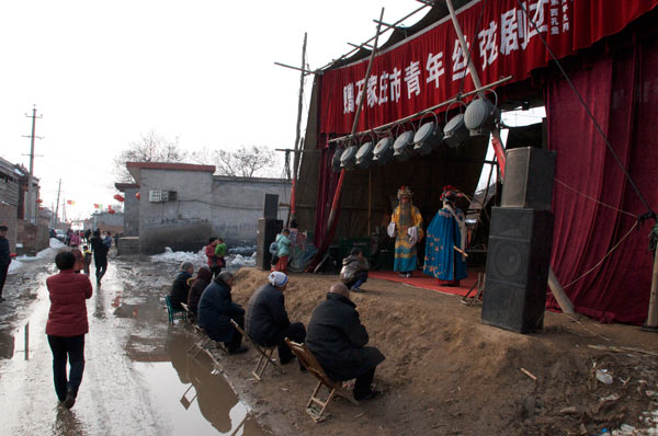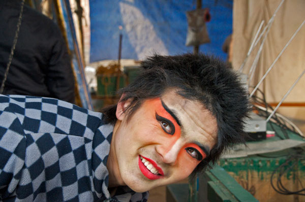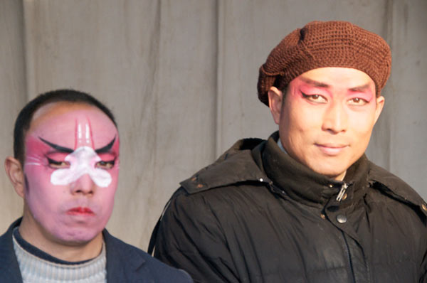 Am Abend wird der Abschluss des Neujahrsfestes am Buddhistischen Tempel gefeiert. Um die Ecke Pekingoper. Sie spielen zweimal. Hier die Nachmittagsvorstellung. Das Publikum sitzt zu beiden Seiten der Straße damit der Verkehr passieren kann.