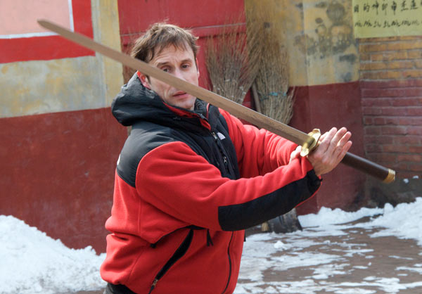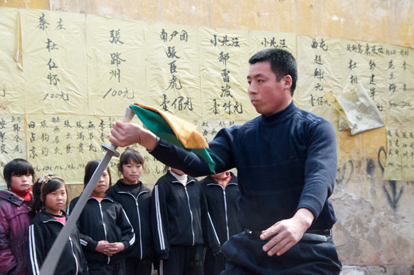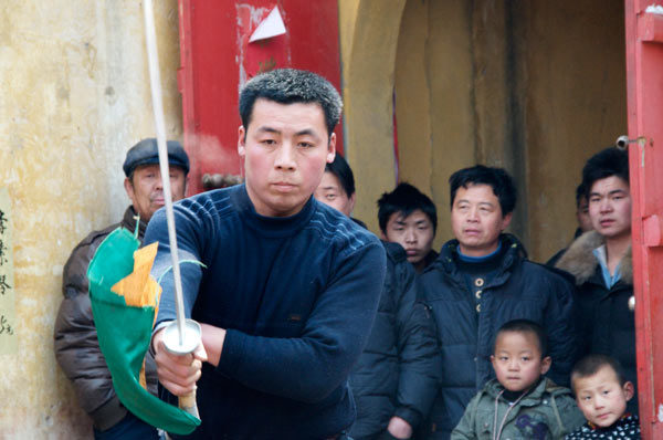 Auch Lu Chao zeigt seine Kunst. Er ist gut. Bei solchen Vorführungen werden üblicherweise Schwerter mit ganz dünnen leichten und extrem flexiblen Klingen genutzt. Das von Lu Chao verwendete hat eine Eisenklinge die gut 4mm dick ist. Dieser Mann ist ein Kraftpaket und dabei gewand und flink.