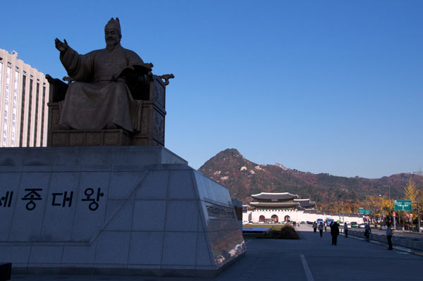 Vor dem Palast ein Denkmal. Es ist König Kim Se Jong (Dshung). Er war ein Reformator, allerdings nicht im religiösen Sinn. Eine von ihm einberufene Expertenkommission, immerhin im ...Jahrhundert, revolutionierte die bis dahin geltenden chinesischen Schriftzeichen.