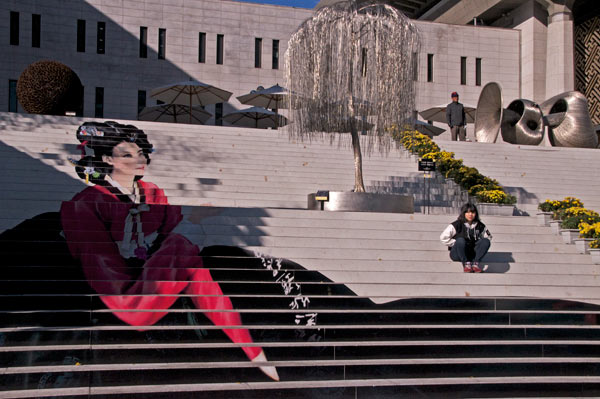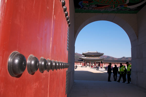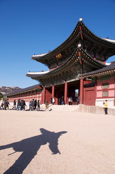 Erster Eindruck, kennt man irgendwie, wenn auch die Anzahl der Nieten an der Pforte hier 12 ist, während es in China immer 9 sind. Die Ähnlichkeit ist dennoch unverkennbar. Irgendwie wirkt auch die koreanische höfische Architektur dem Rittersportstil zu folgen: quadratisch, praktisch, gut. Ein Foto mit dem Shadowman darf nicht fehlen.
