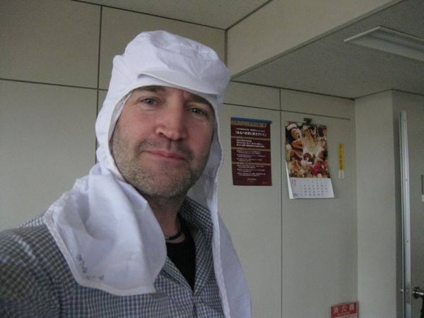 Wir bekommen Haarnetz und Mütze mit Halsabdeckung, frisch gemangelte Kittel und Überzieher für die Schuhe.