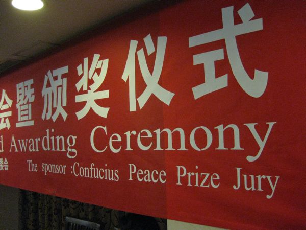 Einen Tag vor der Verleihung des Friedensnobelpreises an Liu Xiaobo fahren wir zum Nobelhotel Beijing News Plaza auf Pekings Prachtstraße Chang An nur wenige Blocks vom Tiananmen, dem Platz des Himmlischen Friedens, entfernt. Vorgestern wurde eine Presseerklärung zur Verleihung des ersten Konfuziusfriedenspreises herausgegeben.Im vierten Stock ist Ein Saal gemietet