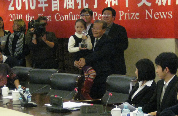 Wie man zum Urteil über Liu Xiaobo stehe, wird gefragt. Die Geschichtsforschung werde diese Frage in 500 Jahren beantworten. Auf die Frage ob man nicht glaube, dass angesichts der Umstände dieses Konfuziusfriedenspreis niemand diese Juryentscheidung ernst nähme, ist die Antwort: Es ginge nur um Frieden und nur darum. Dann kommt der Höhepunkt der Posse. Da der Preisträger nicht anwesend sei habe man sich entschlossen den Preis dennoch symbolisch zu vergeben. Ein kleines Kind wird hervorgeholt und schon hat die Kleine die Glasskulptur, die von meinem Platz aus wie Flipper aussieht und ein Paket in den Händen.