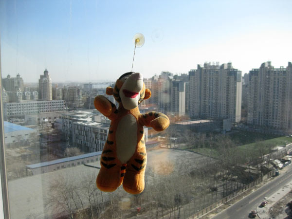 Ach ja, Tigger. Er fand sich in meiner ersten Pekinger Wohnung hinter einer Gardine. Er tat mir leid und hängt seither für alle sichtbar und für ihn mit gutem Überblick am Fenster. Natürlich soll er auch die Chance bekommen Berlin zu sehen. Allerdings werde ich ihn wohl waschen müssen. 15.12. Der letzte Schnitt. Es geht um Baumkuchen für das Mittagsmagazin. Baumkuchen heißt in Japan erstaunlicher Weise auch Baumkuchen. In China hieße er wahrscheinlich "Kuchen aus dem Teig der Jahresringe formt". Dieses Idiom für das deutsche Wort Baumkuchen ist wahrscheinlich falsch aber ebenso wahrscheinlich richtig. Nun habe ich gerade im Wikipedia nachgeschaut und gefunden, dass es idiomatische Redewendung heißen muss, statt Idiom. Warum komme ich darauf? 16.2. Toby und ich wollen zum Teehaus am Konfuziustempel. Ich mich verabschieden und er kennenlernen. Aber es klappt nicht. Er bekommt sein Visum und ich hab einfach noch zu viel zu tun. Am Abend bin ich mit Marc verabredet. Das Weihnachtskonzert an der deutschen Schule geht länger als erwartet. Noch einige Verabschiedungen und ein Gespräch mit einem mir bis dahin unbekannten, aber sehr netten Pärchen über die Frage: Warum Lang Lang als Pianist zwar technisch nahezu perfekt spielen kann, aber dennoch, steinreich, ein armes Schwein ist. Als wir endlich um 10.00 Uhr Marcs Tochter ins Bett bringen fahren, bleiben wir dann doch bei ihm zu Hause. Es wird ein schönes, sehr intensives und privates Gespräch. Ich genieße es. 3.00 Uhr fahre ich zurück ins Hotel. 17.2. 8.30 Uhr. Ich will weg. Ich spüre den Schlafentzug, aber ich bin mental nicht müde. Gestern rief Mike an. Wir waren für einen der letzten Tage eigentlich zum Abendessen bei ihm zu Hause verabredet. Seine Frau hätte mir Jauzhi machen beigebracht. Leider hat es nicht sein sollen. Mikes Mutter ist im Krankenhaus und versucht von einer Hirnblutung zu genesen. Mike und dessen Schwester teilen sich nun die Tagesbetreuung der Mutter. Mike, mit dem mich doch einige schöne Fahrten zur Chinesischen Mauer verbinden und dem ich so manchen Fahrgast organisiert habe, rief also an und bot an mich zum Flughafen zu bringen. Keine Chance der Ablehnung. Er bestand einfach darauf. Er holt mich vom Hotel ab und hat natürlich etwas für mich mitgebracht. Später im Flughafen werde ich die vier Flaschen Baizhou Schnapps leider wegwerfen müssen.